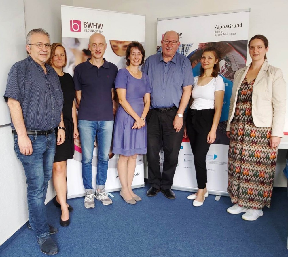 Foto v. l. n. r.: Dogan Yilmaz (BWHW, Wirtschaft integriert), Daniela Evermann (BWHW, Kompo7), Marco Vorberger (BWHW, AlphaGrund, GBZ, BilDA), Dr. Astrid Mannes MdB, Rolf Klatta (BWHW, Regionalleiter), Antonia Schnura (BWHW, AlphaGrund), Daniela Lange (Kreisagentur für Beschäftigung Darmstadt-Dieburg, CHANCE EUROPA)