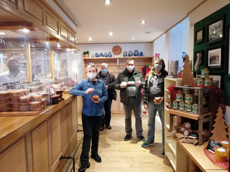 Anschließend wurden die Räumlichkeiten des Jägerhofs in Augenschein genommen. Vom Restaurant über den Frühstücksaal, von der Wirtschaft über die Eventlocation „Eulenfang“. Die Teilnehmenden waren erstaunt, wie viele Personen hier normalerweise täglich bewirtet werden. Betrieb herrschte hingegen in der Wurstküche. Hier macht Hans Schmidt mit seinem Mitarbeiter verschiedene Sorten Wurst und Gerichte im Glas, wie beispielsweise Lammragout oder Rinderrouladen. Diese werden während des Lockdowns am Tresen in der Wirtschaft oder über das Internet verkauft und per Post versendet.